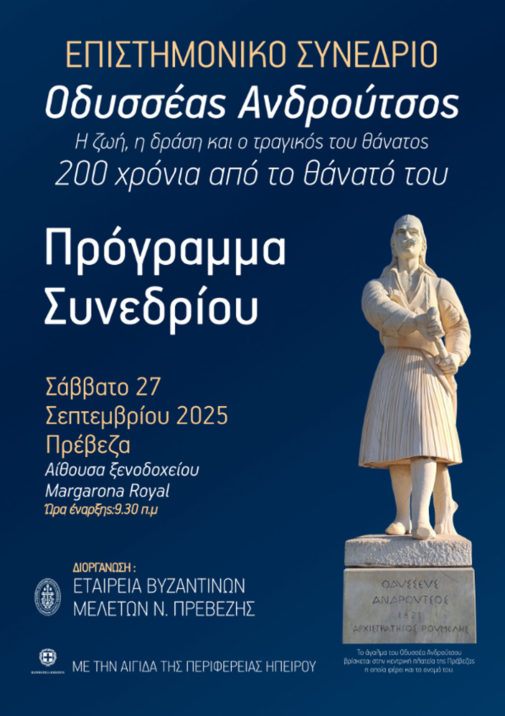 Η πραγματοποίηση του Συνεδρίου που διοργανώνουμε για το Σάββατο 27 Σεπτεμβρίου στην Πρέβεζα, με θέμα τον Οδυσσέα Ανδρούτσο, πλησιάζει σε λίγες μέρες.