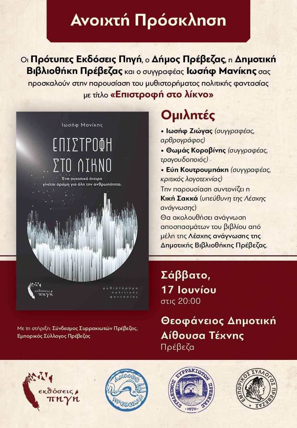 Οι Πρότυπες Εκδόσεις Πηγή, ο Δήμος Πρέβεζας, η Δημοτική Βιβλιοθήκη και ο συγγραφέας Ιωσήφ Μανίκης διοργανώνουν εκδήλωση για την παρουσίαση του μυθιστορήματος πολιτικής φαντασίας με τίτλο «Επιστροφή στο λίκνο».