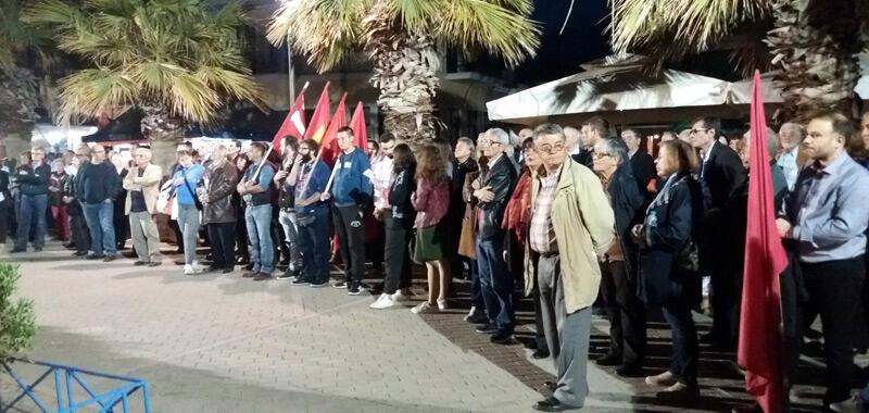 Κεντρικός ομιλητής ήταν ο υποψήφιος ευρωβουλευτής του ΚΚΕ και μέλος της ΚΕ Θανάσης Τζίμας, ο οποίος τόνισε μεταξύ άλλων : «Μόλις πριν λίγες μέρες την 9η Μάη, μέρα της μεγάλης αντιφασιστικής νίκης των λαών, μέρα που κατατροπώθηκε το τέρας του φασισμού με μπροστάρηδες τη μεγάλη Σοβιετική Ένωση και τον Κόκκινο στρατό, τους κομμουνιστές, παντού, και στη χώρα μας, η ΕΕ επέλεξε να ξεράσει το αντικομουνιστικό δηλητήριο της ενάντια στο σοσιαλισμό Αυτή ήταν και είναι η ΕΕ και απέδειξε για μια ακόμα φορά ποιους θεωρεί εχθρούς της: το σοσιαλισμό, τα κομμουνιστικά κόμματα, το εργατικό λαϊκό κίνημα Αυτή η αθλιότητα που υπέγραψαν η Μέρκελ, ο Μακρόν, ο Σαλβίνι, ο Κούρτς, όλοι μαζί σοσιαλδημοκράτες και νεοφιλελεύθεροι, ακροδεξιοί, φέρει φαρδιά πλατιά και την υπογραφή του Έλληνα πρωθυπουργού, του κυρίου Τσίπρα.