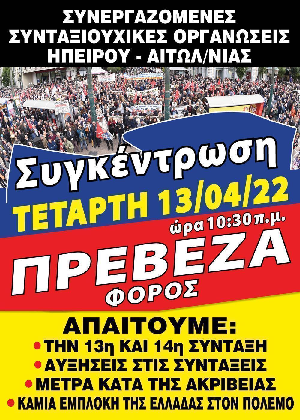 Συλλαλητήριο στις 10:30 το πρωί της Τετάρτης 13/4 στον Φόρο, στην Πρέβεζα, διοργανώνουν οι συνεργαζόμενες συνταξιουχικές οργανώσεις Ηπείρου-Αιτωλ/νιας.