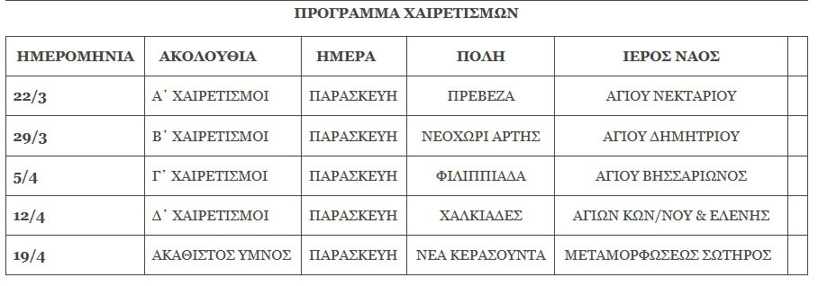 Ὁ Σεβασμιώτατος Μητροπολίτης μας κ. Χρυσόστομος θά χοροστατήσει κατά τίς ἀκολουθίες τῶν Κατανυκτικῶν Ἑσπερινῶν, τῶν Χαιρετισμῶν τῆς Ὑπεραγίας Θεοτόκου καί τοῦ Ἀκαθίστου Ὕμνου, σύμφωνα μέ τό ἀκόλουθο πρόγραμμα: