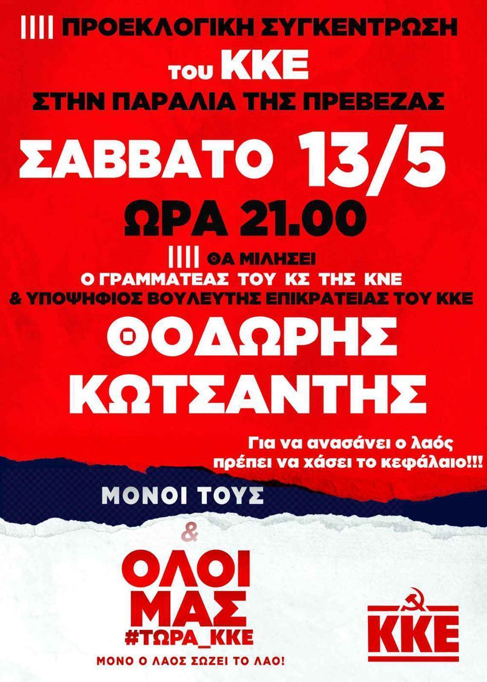 Η κεντρική προεκλογική συγκέντρωση του ΚΚΕ στην Πρέβεζα θα πραγματοποιηθεί το Σάββατο 13 Μάη, στην Παραλία, στις 9.00 μμ. με ομιλητή τον Θοδωρή Κωτσαντή, γραμματέα του ΚΣ της ΚΝΕ και υποψήφιο βουλευτή επικρατείας του ΚΚΕ. Θα χαιρετήσουν υποψήφιοι βουλευτές.