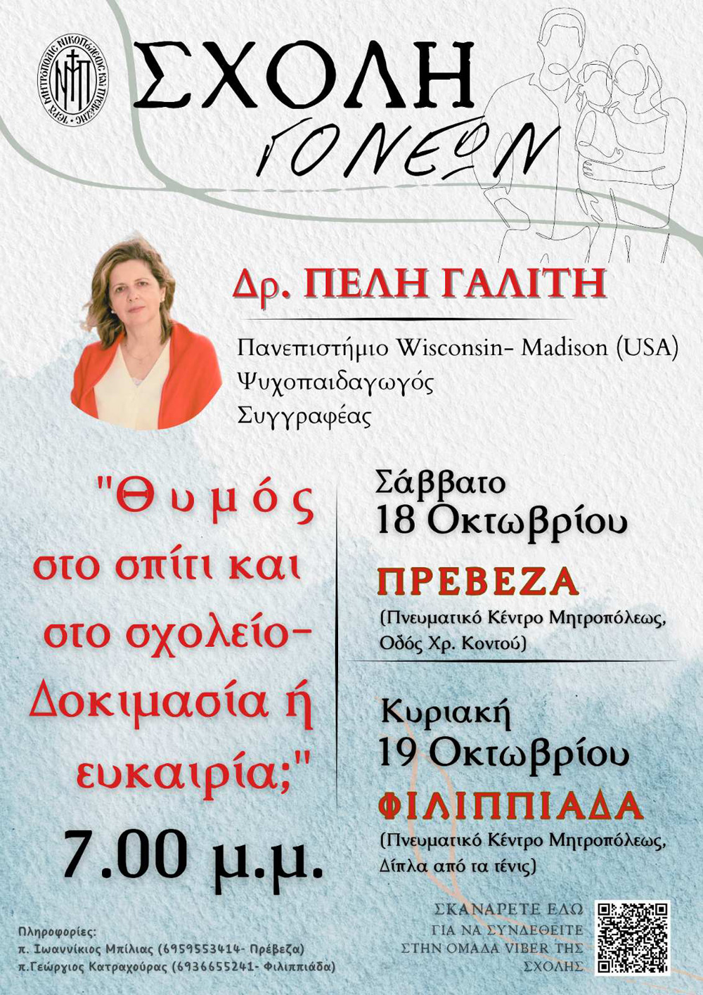 Ομιλήτρια θα είναι η Δρ. Πέλη Γαλίτη, Πανεπιστήμιο Wisconsin-Madison (USA), Ψυχοπαιδαγωγός, Συγγραφέας, μέ θέμα: «Θυμός στό σπίτι καί στό σχολείο-Δοκιμασία ή Ευκαιρία;»