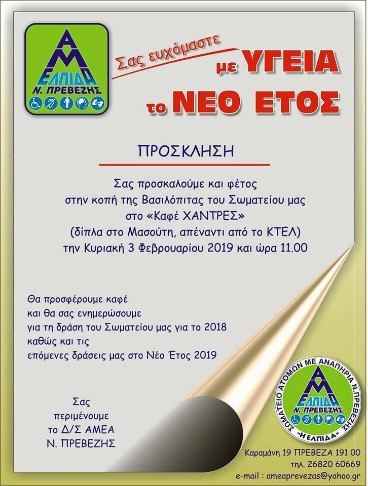 Το Σωματείο ΑμεΑ Ν. Πρέβεζας «Η ΕΛΠΙΔΑ» θα κόψει την Βασιλόπιτα στο καφέ «Χάντρες» (δίπλα στο σούπερ μάρκετ Μασούτη, απέναντι από το ΚΤΕΛ) την Κυριακή 3 Φεβρουαρίου στις 11 το πρωί.