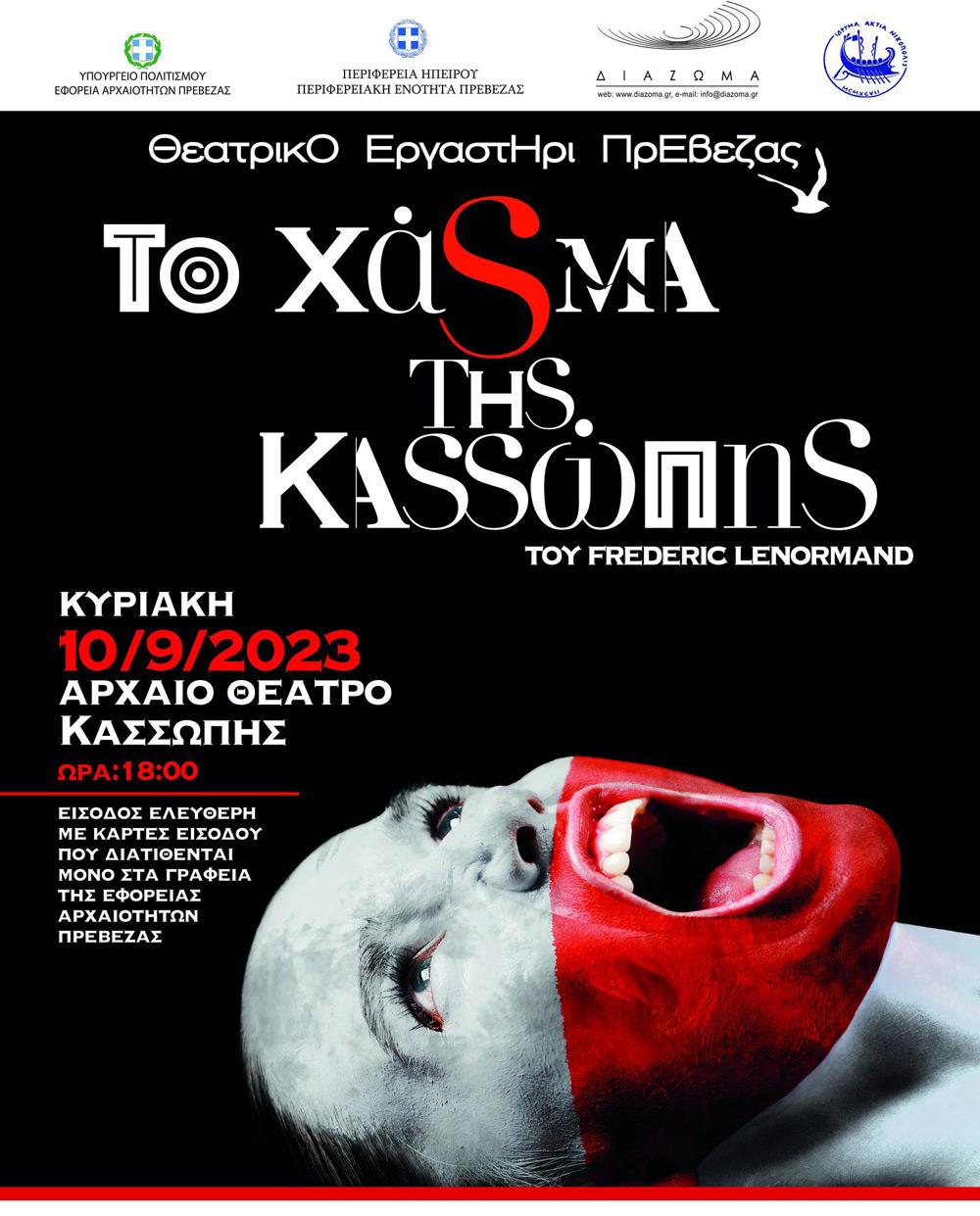 Την Κυριακή 10 Σεπτεμβρίου και ώρα 18:00 θα παρουσιαστεί στο αρχαίο θέατρο της Κασσώπης το έργο «Το χάσμα της Κασσώπης» του Frédéric Lenormand από το Θεατρικό Εργαστήρι Πρέβεζας το οποίο φέτος συμπληρώνει 25 χρόνια θεατρικής παρουσίας.