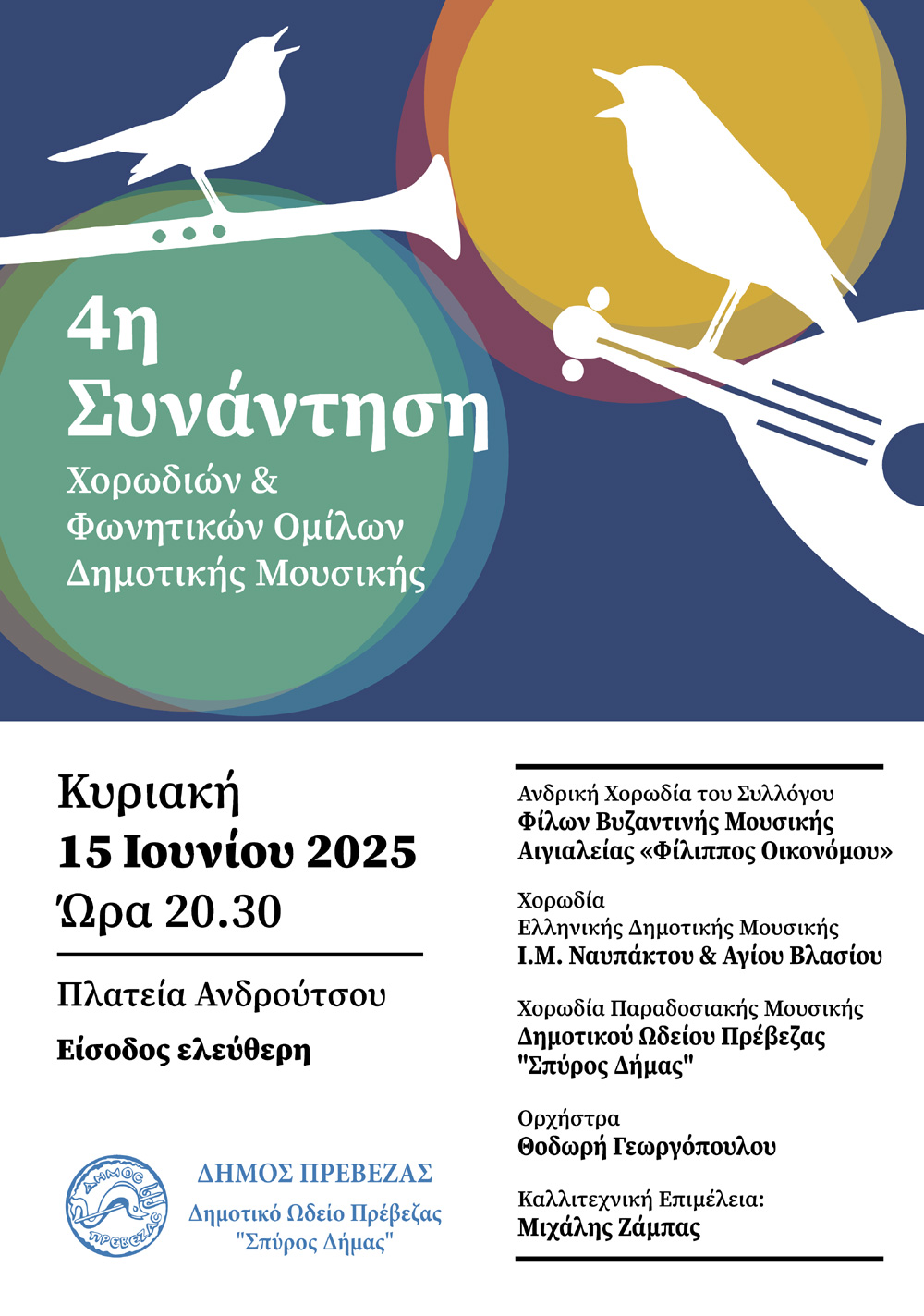Πρόκειται για την 4η Συνάντηση Χορωδιών και Φωνητικών Ομίλων που διοργανώνεται από το Δημοτικό Ωδείο “Σπύρος Δήμας” και τον Δήμο Πρέβεζας με την καλλιτεχνική επιμέλεια του μαέστρου της Παραδοσιακής Χορωδίας του Δημοτικού Ωδείου Μιχάλη Ζάμπα.