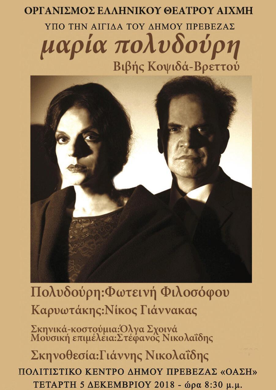 Η θεατρική παράσταση “Μαρία Πολυδούρη” μέσα από ένα ευαίσθητο και συνάμα επιβλητικό έργο της ποιήτριας και συγγραφέως Βιβής Κοψιδά-Βρεττού, θα παρουσιαστεί την Τετάρτη 5 Δεκεμβρίου στις 8.30 το βράδυ στην αίθουσα του Πολιτιστικού Κέντρου Πρέβεζας.