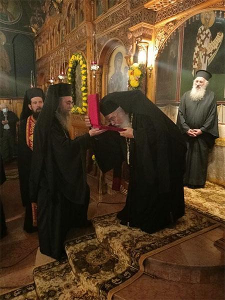 Πρό τοῦ πέρατος τῆς Ἀκολουθίας τοῦ Ἑσπερινοῦ ὁ Πρωτοσύγκελλος τῆς Ἱερᾶς Μητροπόλεώς μας Ἀρχιμ. Σίμων Δημογέροντας προσέφερε ἐξ ὀνόματος καί ἐκ προσώπου τοῦ Ἱεροῦ Κλήρου τῆς Μητροπόλεώς μας στόν ἑορτάζοντα Σεβ. Μητροπολίτη μας ὡς δῶρον ἀγάπης καί σεβασμοῦ πρός τό σεπτό Πρόσωπό του ἕνα ζεῦγος σταυροεγκολπίου, ἐπί τῇ συμπληρώσει τῆς δεκαετοῦς ποιμαντορίας του στήν ἀποστολική Μητρόπολη Νικοπόλεως καί Πρεβέζης.