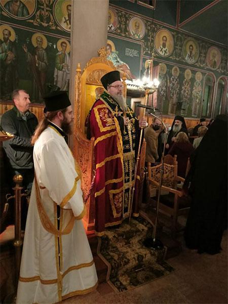Πρό τῆς ἀπολύσεως τῆς Θείας Λειτουργίας ὁ Σεβασμιώτατος Μητροπολίτης μας, ἀπευθυνόμενος στό ἐκκλησίασμα εὐχαρίστησε γιά τήν παρουσία τους ὡς ἔνδειξη τιμῆς τόσο πρός τόν ἑορταζόμενο Ἅγιο ὅσο καί πρός τό πρόσωπό του καί ὑπενθύμισε σέ ὅλους ὅτι ἡ στάση μας ἀπέναντι στό Θεό πρέπει νά εἶναι εὐχαριστιακή καί δοξολογική εἴτε γιά τίς δυσκολίες εἴτε γιά τίς εὐεργεσίες Του, χρησιμοποιώντας τά λόγια τοῦ ἱεροῦ Χρυσοστόμου ὅταν ἦταν ἐξόριστος «Δόξα τῷ Θεῷ πάντων ἕνεκεν».