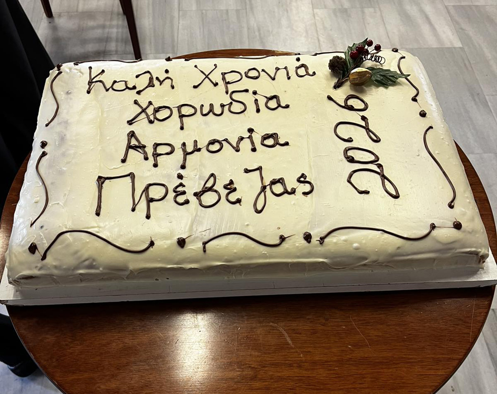 Την πρωτοχρονιάτικη πίτα ευλόγησε και έκοψε ο Σεβασμιώτατος Μητροπολίτης Πρέβεζας κ. κ. Χρυσόστομος, απευθύνοντας πατρικές ευχές προς τα μέλη της Χορωδίας και τις οικογένειές τους. Χαιρετισμό απηύθυναν επίσης ο Βουλευτής Πρέβεζας κ. Κωνσταντίνος Μπάρκας και ο κ. Γιώργος Νίτσας.