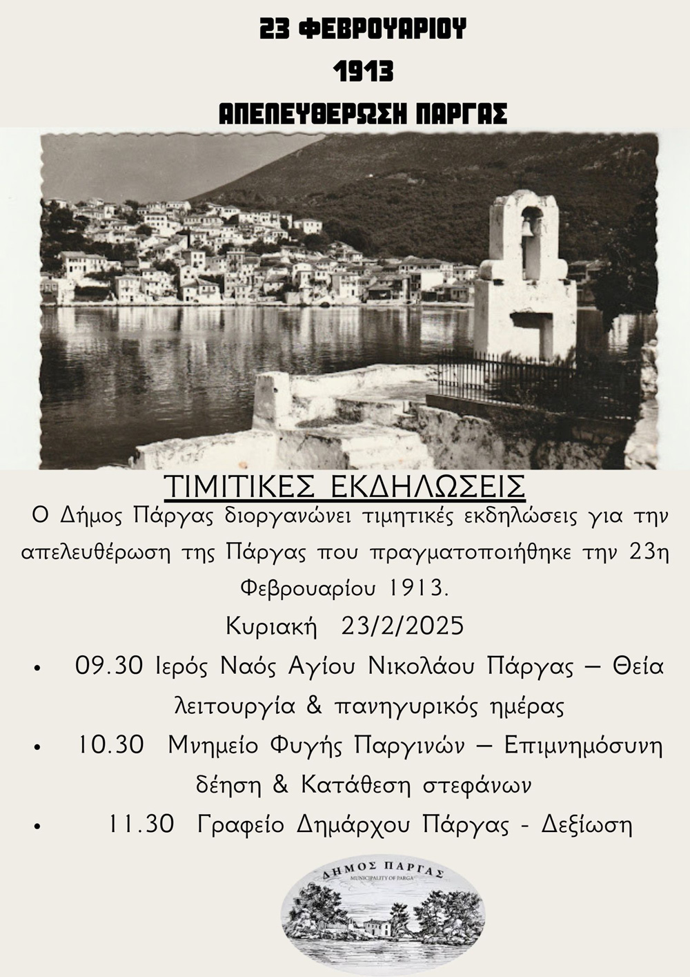 Ο Δήμος Πάργας διοργανώνει τιμητικές εκδηλώσεις για την απελευθέρωση της Πάργας που πραγματοποιήθηκε την 23η Φεβρουαρίου 1913. Αναλυτικά: