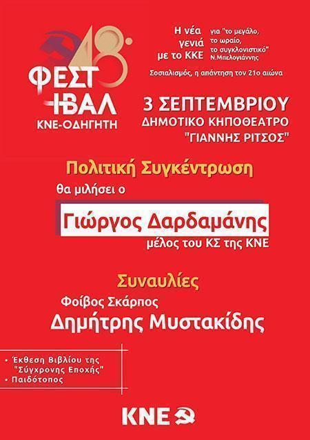 Το Φεστιβάλ ΚΝΕ-Οδηγητή είναι το µεγαλύτερο πολιτικό – πολιτιστικό γεγονός της χώρας! Με σύνθημα: Η νέα γενιά με το ΚΚΕ με το ΚΚΕ για “το μεγάλο, το ωραίο, το συγκλονιστικό” (Ν.Μπελογιάννης)