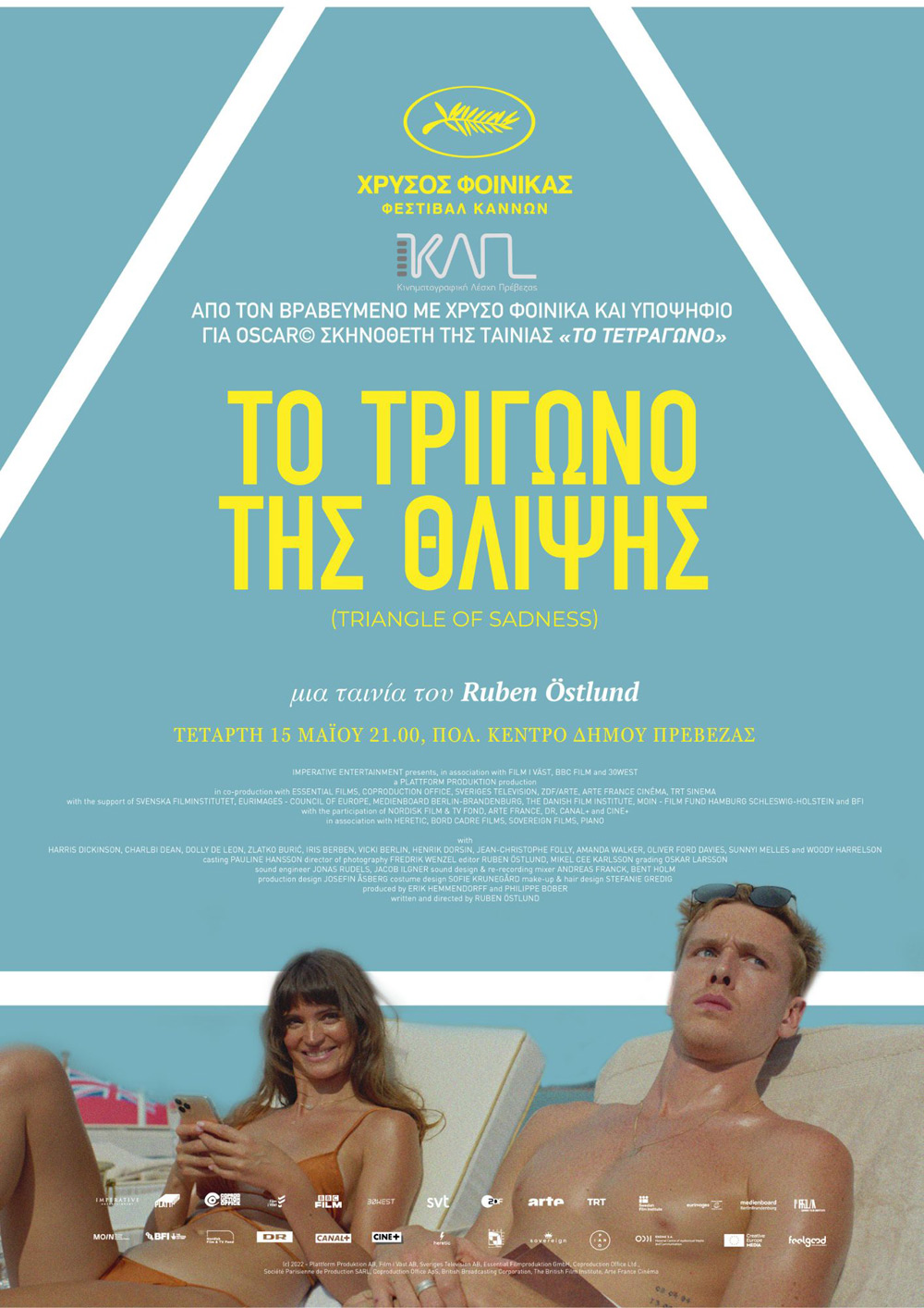 Tην βραβευμένη με Χρυσό Φοίνικα στο 75ο Φεστιβάλ Καννών ταινία του του Ruben Östlund « Tο Τρίγωνο της Θλίψης » προβάλλει η Κινηματογραφική Λέσχη Πρέβεζας την Τετάρτη 15 Μάιου στις 21.00 στο Πολιτιστικό Κέντρο Πρέβεζας. Εισιτήριο 4 ευρώ για φοιτητές, 6 ευρώ γενική είσοδο, και δωρεάν είσοδο για μαθητές και ανέργους.