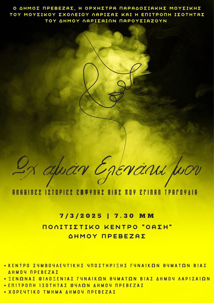 Ο Δήμος Πρέβεζας σε συνεργασία με την Επιτροπή Ισότητας Φύλων του Δήμου Λάρισας και την Ορχήστρα Παραδοσιακής Μουσικής του Μουσικού Σχολείου Λάρισας, σας προσκαλούν στην μουσική εκδήλωση «Ωχ Αμάν Ελενάκι μου» - Αληθινές Ιστορίες Έμφυλης Βίας που Έγιναν Τραγούδια. που θα πραγματοποιηθεί την Παρασκευή 7 Μαρτίου ώρα 19.30 στο Πολιτιστικό Κέντρο Δήμου Πρέβεζας με ελεύθερη είσοδο για το κοινό.