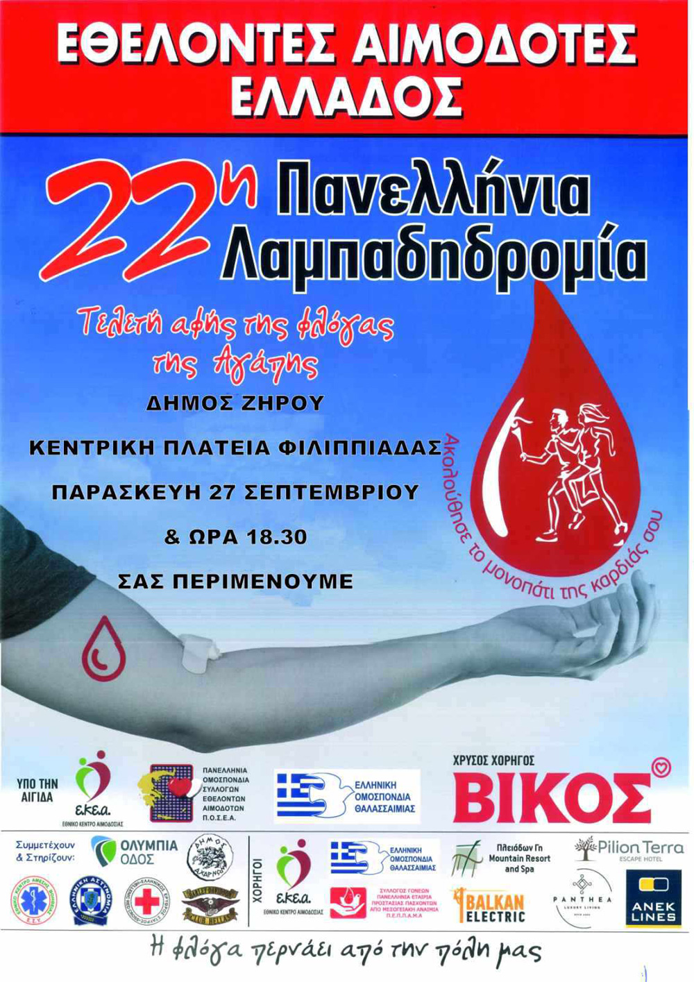 Η 22η Πανελλήνια Λαμπαδηδρομία των Εθελοντών Αιμοδοτών θα πραγματοποιηθεί στο Δήμο μας την Παρασκευή 27 Σεπτεμβρίου. Στην κεντρική πλατεία Φιλιππιάδας στις 18:30 θα γίνει η μεταφορά της φλόγας της πανελλήνιας εθελοντικής λαμπαδηδρομίας.