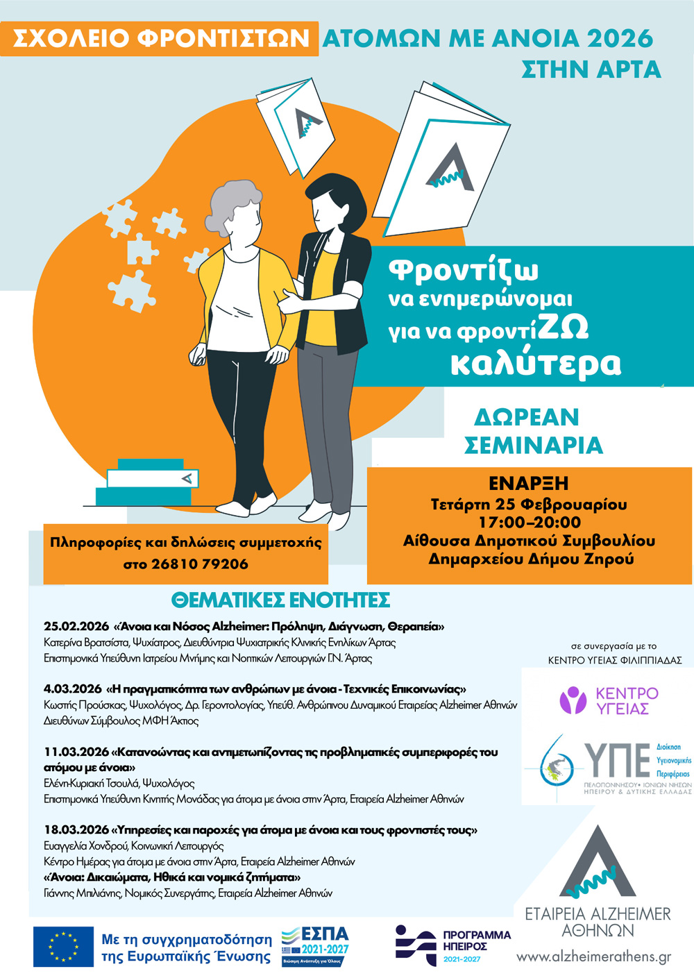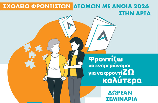 Το Κέντρο Ημέρας για άτομα με Άνοια και η Κινητή Μονάδα Άρτας της Εταιρείας Alzheimer Αθηνών, σε συνεργασία με το Κέντρο Υγείας Φιλιππιάδας, διοργανώνουν στην πόλη της Φιλιππιάδας τον εκπαιδευτικό θεσμό «Σχολείο Φροντιστών». Πρόκειται για έναν δομημένο κύκλο επιμορφωτικών σεμιναρίων που απευθύνεται σε οικογενειακούς και άτυπους φροντιστές ατόμων με άνοια, καθώς και στο ευρύ κοινό.