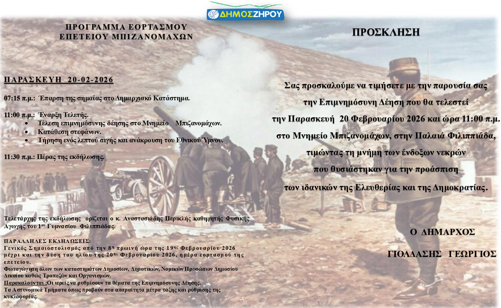 Ο εορτασμός της Επετείου των Μπιζανομάχων θα πραγματοποιηθεί την Παρασκευή 20 Φεβρουαρίου στις 11:00 π.μ., στο Μνημείο Μπιζανομάχων, στην Παλαιά Φιλιππιάδα.