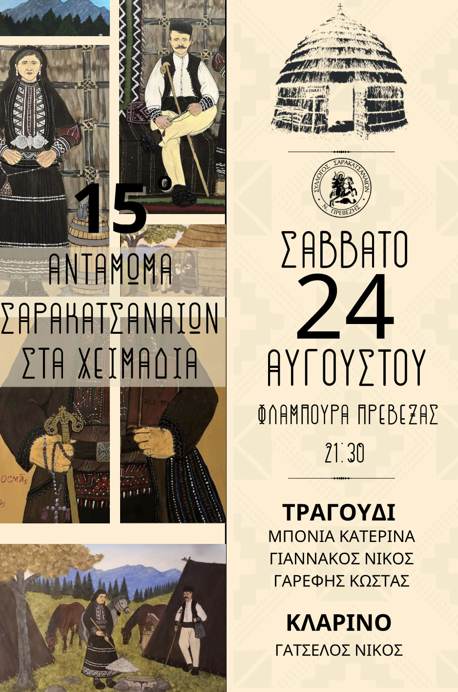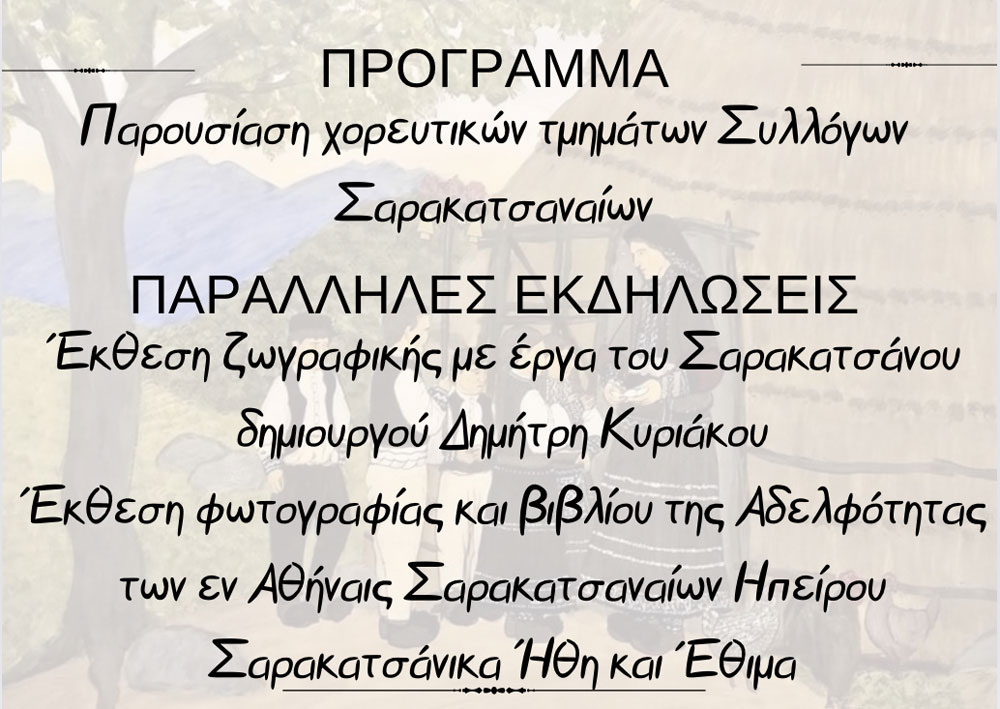 Παραδοσιακοί χοροί και τραγούδια θα παρουσιαστούν από τα χορευτικά τμήματα του Συλλόγου Σαρακατσαναίων Ν. Πρεβέζης και των φιλοξενούμενων Συλλόγων Σαρακατσαναίων.