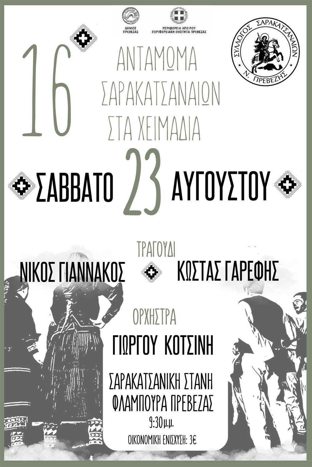 Επιλεγμένοι παραδοσιακοί χοροί και τραγούδια θα παρουσιαστούν από τα χορευτικά τμήματα του Συλλόγου Σαρακατσαναίων Ν. Πρεβέζης και των φιλοξενούμενων Συλλόγων Σαρακατσαναίων. Την εκδήλωση θα πλαισιώσουν με τα τραγούδια τους οι κορυφαίοι Σαρακατσαναίοι ερμηνευτές Νίκος Γιαννακός και Κώστας Γαρέφης και θα συνοδεύσουν οι ταλαντούχοι μουσικοί Γιώργος Κωτσίνης στο κλαρίνο, Κώστας Κωσταγιώργος στο βιολί, Γιάννης Γαλάνης στο λαούτο και Διαμαντής Παπαναστασίου στα κρουστά.