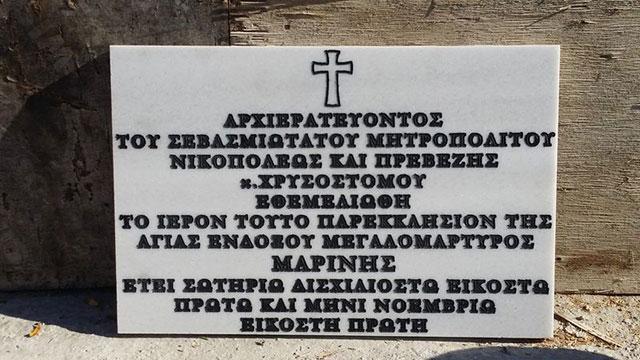 Στις 21 Νοεμβρίου ανήμερα της εορτής των Εισοδίων της Υπεραγίας Θεοτόκου έγινε η θεμελίωση του ιερού παρεκκλησίου της Αγίας μεγαλομάρτυρος Μαρίνης από τον Σεβ. Μητροπολίτη μας κ. Χρυσόστομο με τη συμμετοχή ιερέων και κατοίκων του χωριού.