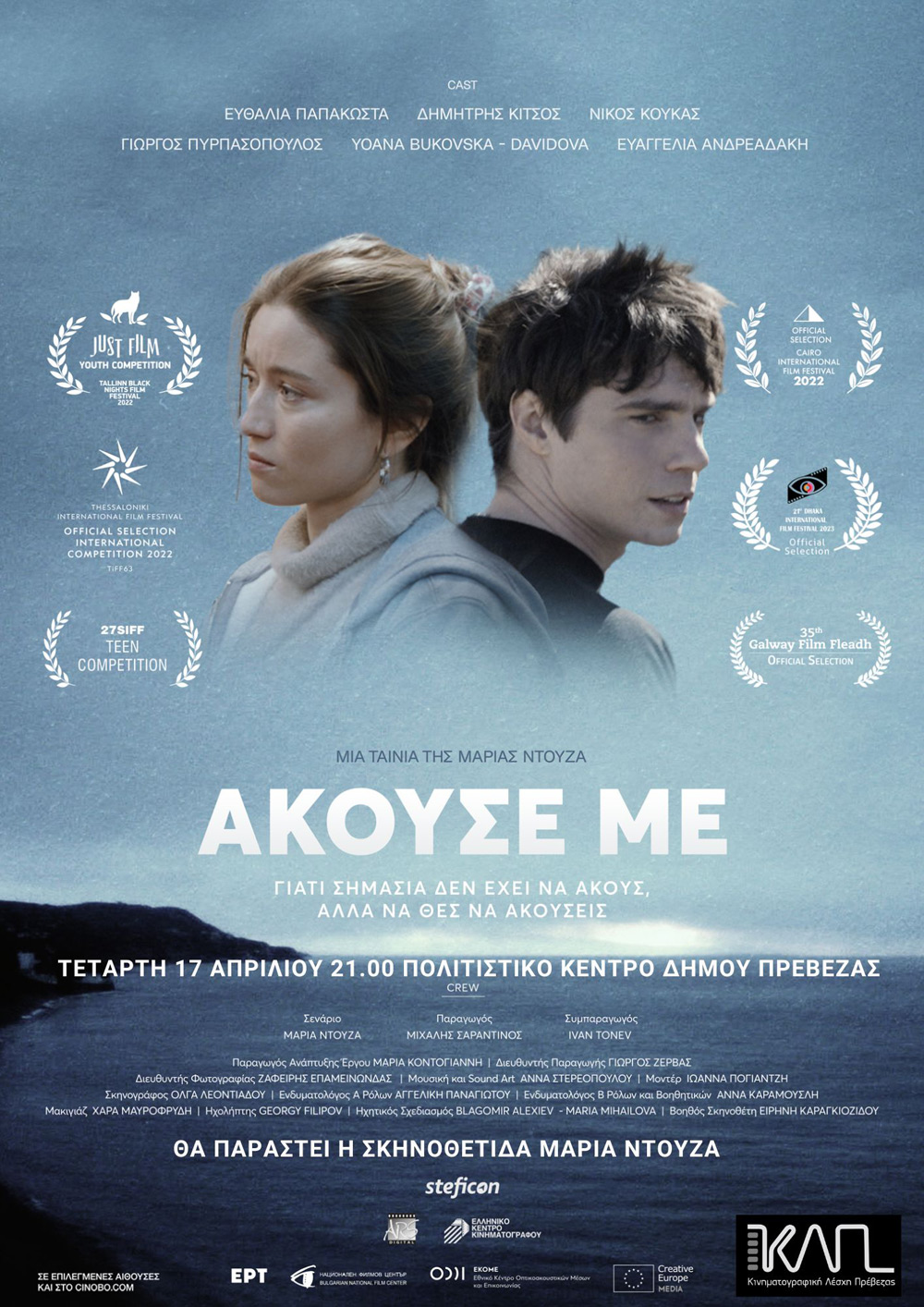 Η Κινηματογραφική Λέσχη Πρέβεζας πιστή στην προβολή ταινιών με κινηματογραφικό χαρακτήρα και αισθητική, προβάλει την ταινία «Άκουσε με» της Μαρίας Ντούζα την Τετάρτη 17 Απριλίου στις 21.00 στο Πολιτιστικό Κέντρο Πρέβεζας με την παρουσία της σκηνοθέτιδας Μαρίας Ντούζα. Εισιτήριο 4 ευρώ για φοιτητές, 6 ευρώ γενική είσοδο, και δωρεάν είσοδο για μαθητές και ανέργους.