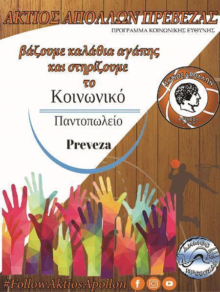 Το Πρόγραμμα Κοινωνικής Ευθύνης της ομάδας μας έχει ως αφετηρία την συνεργασία με το Κοινωνικό Παντοπωλείο Πρέβεζας με στόχο την ενίσχυση των κοινωνικών δομών του Δήμου Πρέβεζας και της τοπικής κοινωνίας αλλά και την ευαισθητοποίηση όλο και περισσότερων πολιτών . Η συνεργασία με το Κοινωνικό Παντοπωλείο και Κοινωνικό Φαρμακείο Δήμου Πρέβεζας θα περιλαμβάνει ένα πλέγμα δραστηριοτήτων παράλληλα με τις αγωνιστικές υποχρεώσεις της ομάδας μας.