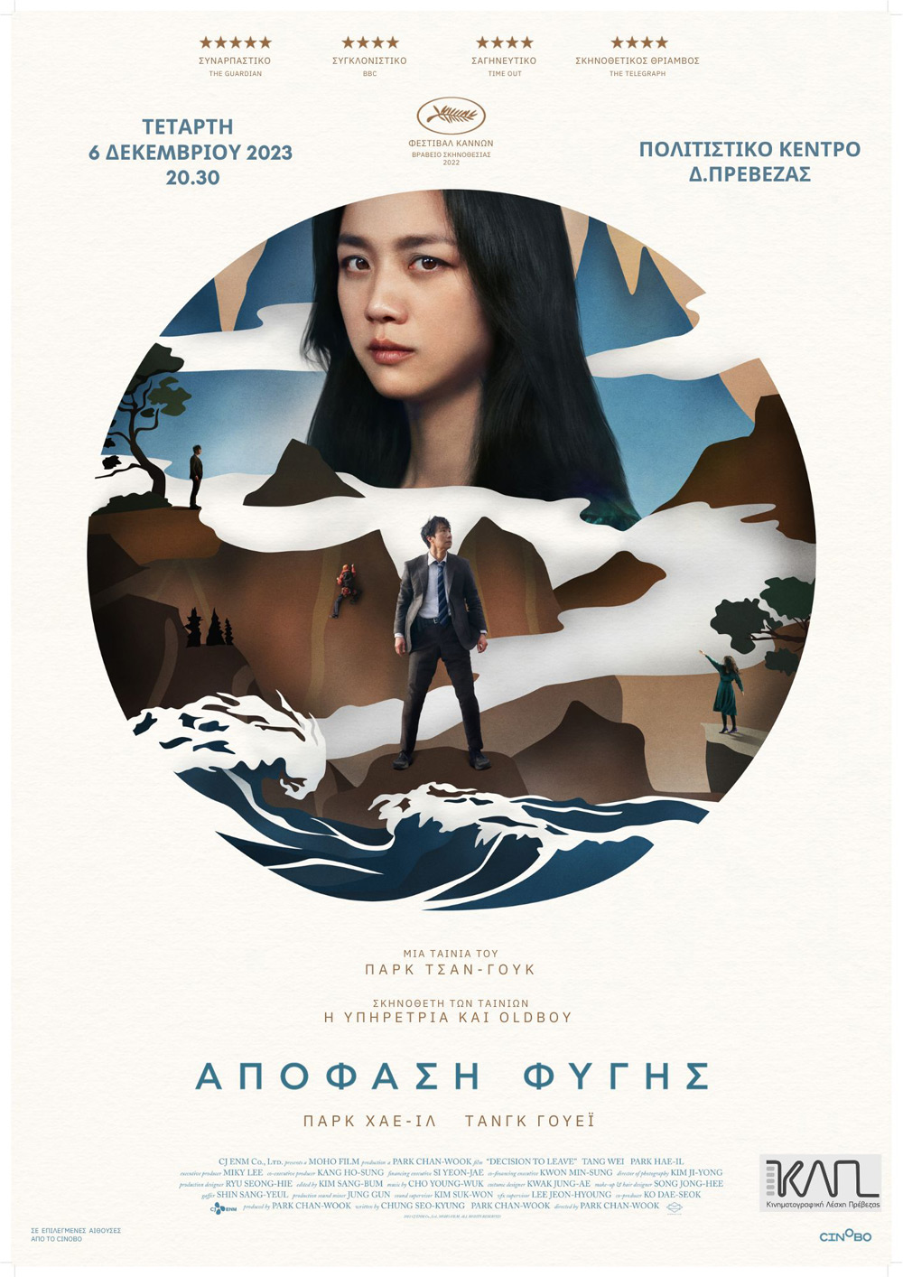 Η Κινηματογραφική Λέσχη Πρέβεζας πιστή στην προβολή ταινιών με κινηματογραφικό χαρακτήρα και αισθητική, προβάλει την ταινία " Απόφαση Φυγής '' σε σκηνοθεσία Παρκ Τσαν-γουκ, αυτή την Τετάρτη 6 Δεκεμβρίου στις 20.30 στο Πολιτιστικό Κέντρο Πρέβεζας με εισιτήριο 4 ευρώ για φοιτητές, 6 ευρώ γενική είσοδο, και δωρεάν είσοδο για μαθητές και ανέργους.