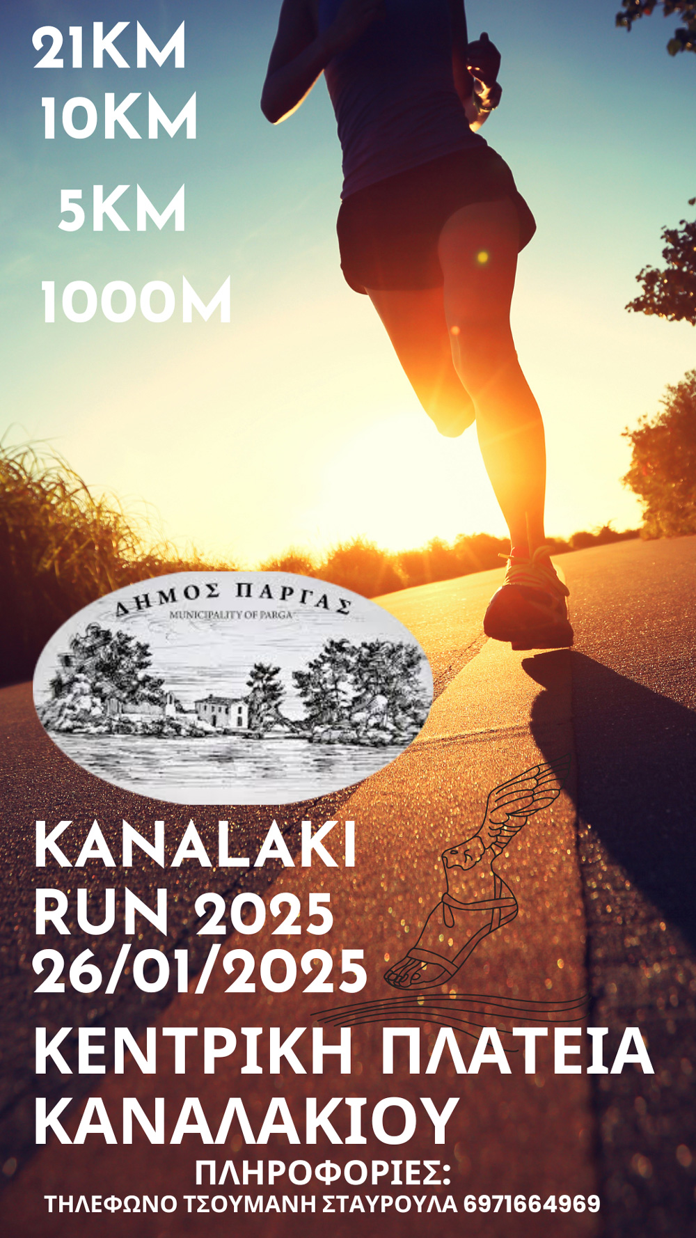 Ο Δήμος Πάργας στα πλαίσια θεσμοθέτησης αθλητικών εκδηλώσεων με κύριο στόχο την ανάπτυξη του μαζικού λαϊκού αθλητισμού και την προβολή της περιοχής, διοργανώνει στις 26/01/2025 δρομικό event με την ονομασία « Kanalaki Run 2025». Ο αγώνας θα έχει ως αφετηρία την Κεντρική Πλατεία Καναλακίου.