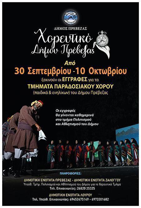 Οι ελληνικοί παραδοσιακοί χοροί βοηθούν ψυχικά και σωματικά τους χορευτές και τους μεταλαμπαδεύουν την αγάπη τους για την παράδοση , η οποία δεν πρέπει να λησμονείται στο χρόνο , αλλά να παραμένει ζωντανή μέσω της εκμάθησής τους . Ο Δήμος Πρέβεζας με τη διδασκαλία των παραδοσιακών χορών σε παιδιά εφήβους και ενήλικες διαιωνίζει και προβάλλει με περηφάνια και αυθεντικότητα την παράδοση.