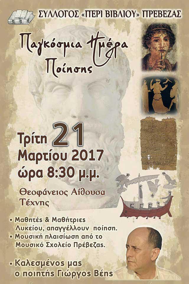 Ο Σύλλογος «Περί βιβλίου» Πρέβεζας, με αφορμή την Παγκόσμια Ημέρα Ποίησης, διοργανώνει εκδήλωση την Τρίτη 21 Μαρτίου στις 8.30 μ.μ., στη Θεοφάνειο αίθουσα τέχνης.