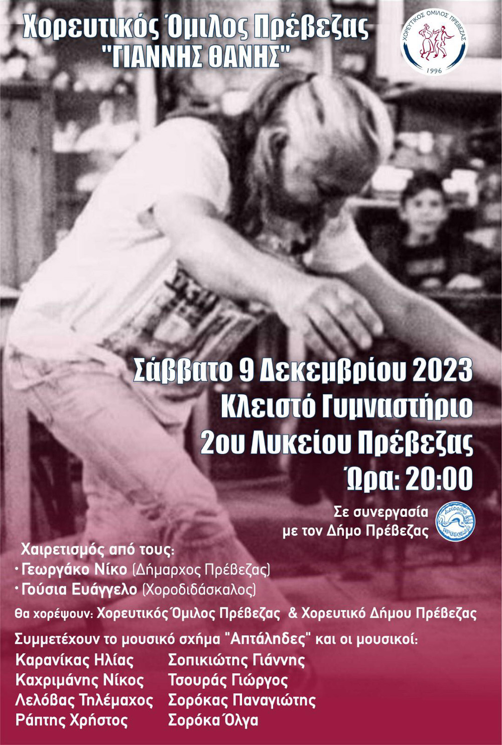 Το Σάββατο στις 8 μμ στο 2ο Λύκειο στη μνήμη του Γιάννη Θάνη συναντιούνται ο Χορευτικός όμιλος Πρέβεζας με το Χορευτικό του Δήμου και με μουσικούς τη πόλης σε μια όμορφη βραδιά στη μνήμη του.