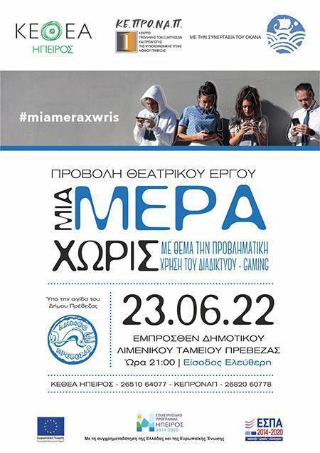Το ΚΕΘΕΑ Ήπειρος σε συνεργασία με το ΚΕ.ΠΡΟ.ΝΑ.Π. και την υποστήριξη του Δήμου Πρέβεζας διοργανώνουν, την Πέμπτη 23 Ιουνίου στις 21:00 έμπροσθεν του Δημοτικού Λιμενικού Ταμείου Πρέβεζας, δωρεάν προβολή του μαγνητοσκοπημένου θεατρικού έργου «Μια μέρα χωρίς» με θέμα την εξάρτηση από το Διαδίκτυο/Gaming. Η προβληματική χρήση του Διαδικτύου και του Gaming αποτελεί ένα από τα σημαντικότερα ζητήματα στη σύγχρονη κοινωνία που απασχολεί έντονα τους γονείς, τους εκπαιδευτικούς, τους κοινωνικούς φορείς και τα ίδια τα νέα μέλη της κοινωνίας. Η προβολή διαρκεί περίπου μία ώρα και θα ακολουθήσει συζήτηση.