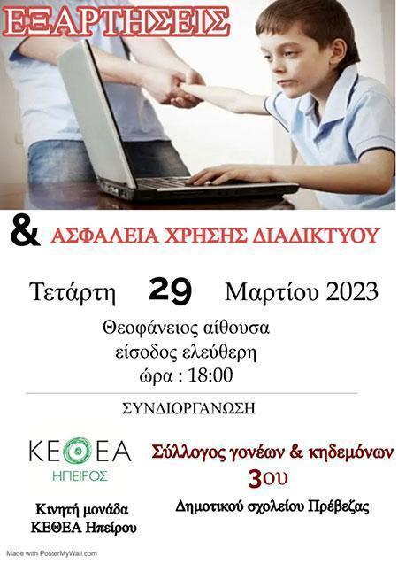 Ο Σύλλογος γονέων και κηδεμόνων του 3ου Δημοτικού σχολείου Πρέβεζας σε συνεργασίας με την κινητή μονάδα ΚΕΘΕΑ Ηπείρου διοργανώνουν την εκδήλωση την Τετάρτη 29 Μαρτίου στις 18:00 στην Θεοφάνειο αίθουσα με θέμα : " Εξαρτήσεις και ασφάλεια χρήσης διαδικτύου".