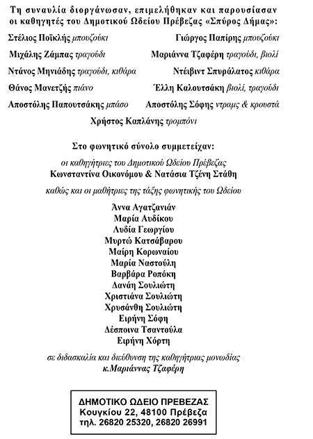 Με ομιλία θα ξεκινήσει η εκδήλωση και θέμα: «ΜΙΚΗΣ και ΠΡΕΒΕΖΑ … Με το λύχνο του άστρου … Άξιος Εστί …» από τον πρώην Δήμαρχο Πρέβεζας κ.Νίκο Γιαννούλη, στη θητεία του οποίου ανακηρύχθηκε ο Μίκης Θεοδωράκης επίτι-μος δημότης Πρέβεζας (1985). Θα ακολουθήσει συναυλία με πολυμελή ορχήστρα και φωνητικό σύνολο των καθηγητών του Δημοτικού Ωδείου Πρέβεζας «Σπύρος Δήμας», οι οποίοι θα ερμηνεύσουν γνωστά και αγαπημένα τραγούδια του Μίκη Θεοδωράκη.