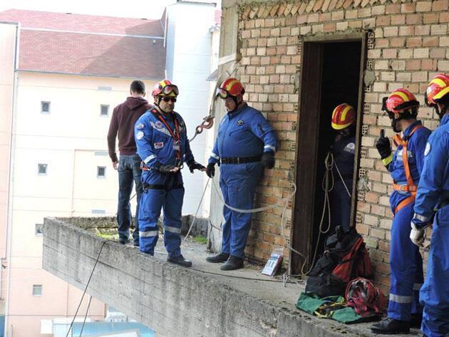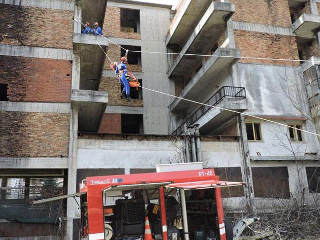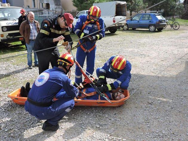 - και μεταφορά από τον δεύτερο όροφο τραυματία με χρήση φορείου και συρματόσχοινου προς τον χώρο υποδοχής..