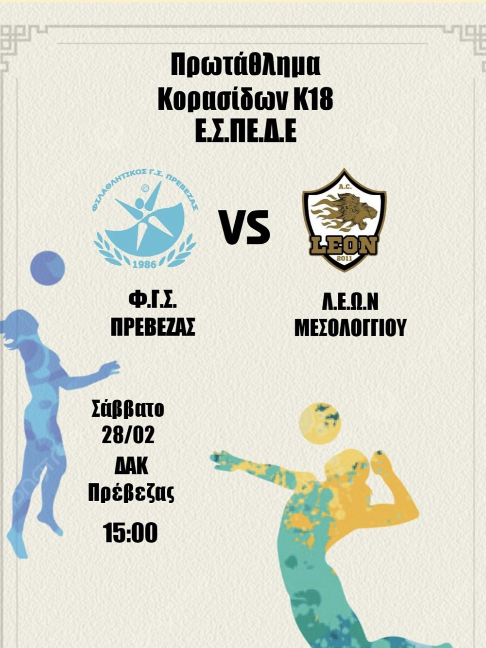 Το Σάββατο 28/2/26 στις 15:00 στο ΔΑΚ ΠΡΕΒΕΖΑΣ οι κορασίδες του ΦΙΛΑΘΛΗΤΙΚΟΥ δίνουν σημαντικό αγώνα για τη τέταρτη αγωνιστική του Γ´ ομίλου του Πρωταθλήματος Βορειοδυτικής Ελλάδας Κ-18 ενάντια στην ισόβαθμη στη πρώτη θέση του βαθμολογικού πίνακα ομάδα ΛΕΩΝ ΜΕΣΟΛΟΓΓΙΟΥ.