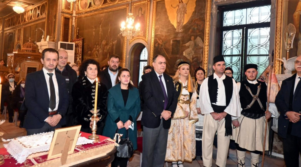 Η τελετή συνεχίστηκε έμπροσθεν του Ιερού Ναού όπου Βρίσκεται η περίτεχνη μαρμάρινη Λάρνακα όπου είναι εναποτεθειμένα τα οστά του Αλέξανδρου Υψηλάντη.
