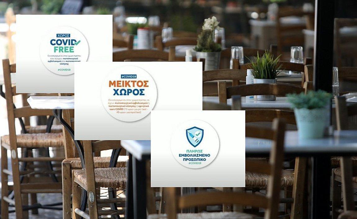 Μάλιστα, κατά τη διάρκεια της ενημέρωσης δόθηκαν στη δημοσιότητα και τα δύο σήματα, τα οποία θα μπορούν να κατεβάσουν οι εργοδότες από το gov.gr, να τα τοποθετούν σε εμφανές σημείο στις επιχειρήσεις τους και έτσι να ενημερώνουν τους πελάτες τους για το αν ο κλειστός χώρος της επιχείρησης (μη υπαίθριος) είναι μόνο για εμβολιασμένους πολίτες ή και ο εισερχόμενος στον χώρο (εάν δεν είναι εμβολιασμένος) θα πρέπει να έχει κάνει τεστ ανίχνευσης κορωνοϊού.