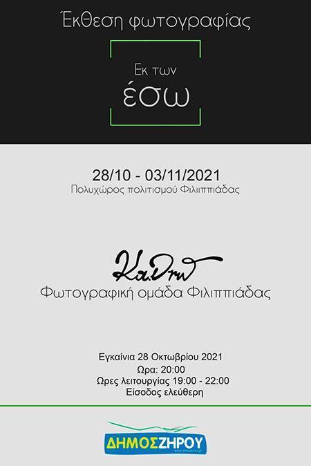 Η Φωτογραφική Ομάδας ΦιλιππιάδαςΚα.Δρώμε χαρά σας προσκαλεί στην ετήσια έκθεση των μελών της, με τίτλο «Εκ των Έσω».Τα εγκαίνια θα γίνουν την Πέμπτη 28 Οκτωβρίου στις 20:00 μμ στον Πολυχώρο Πολιτισμού Φιλιππιάδας (Παλαιό Δημαρχείο).Η έκθεση θα διαρκέσει από τις 28 Οκτωβρίου έως τις 03 Νοεμβρίου και η είσοδος είναι δωρεάν για το κοινό με ώρες λειτουργίας19:00-22:00 καθημερινά. Η έκθεση με τίτλο Εκ τωνΈσω , η κεντρική έκθεση της Κα.Δρώ , είναι το αποτέλεσμα των σεμιναρίων φωτογραφίας για την περίοδο 2020-21 με εισηγητή τον Δημήτρη Ραπακούση.