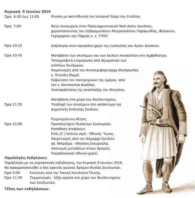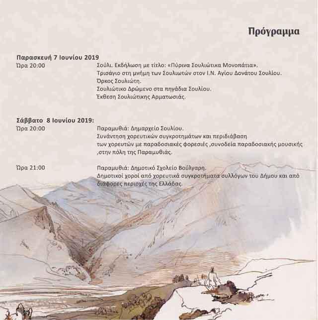 Εορταστικές εκδηλώσεις σε ανάμνηση του Ολοκαυτώματος του Σουλίου και της αυτοθυσία του καλόγερου Σαμουήλ και των Σουλιωτών υπέρ της Ελευθερίας θα πραγματοποιηθούν την Παρασκευή 7 Ιουνίου και το Σάββατο 8 Ιουνίου στο Σούλι και την Παραμυθιά με αποκορύφωνα την Κυριακή 9 Ιουνίου στο ιστορικό χώρο του Σουλίου.