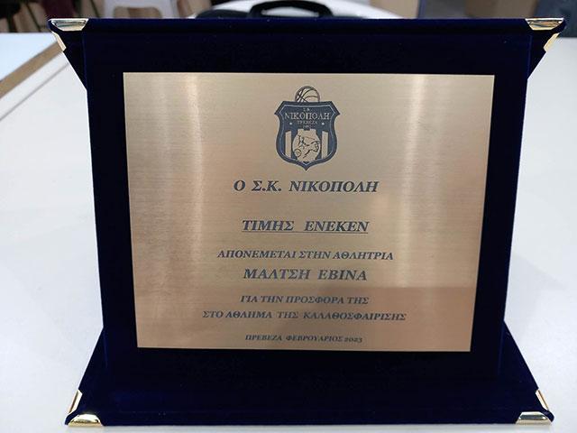 Ο ΣΚ Νικόπολη απένειμε τιμητική πλακέτα στην Εβίνα Μάλτση για την προσφορά της στο Ελληνικό μπάσκετ. Η Διοίκηση και οι προπονητές του ΣΚ Νικόπολη, ευχαριστούν θερμά την Εβίνα Μάλτση και ανυπομονούν για την επόμενη συνεργασία με αντίστοιχες δράσεις και ακόμα μεγαλύτερη συμμετοχή.