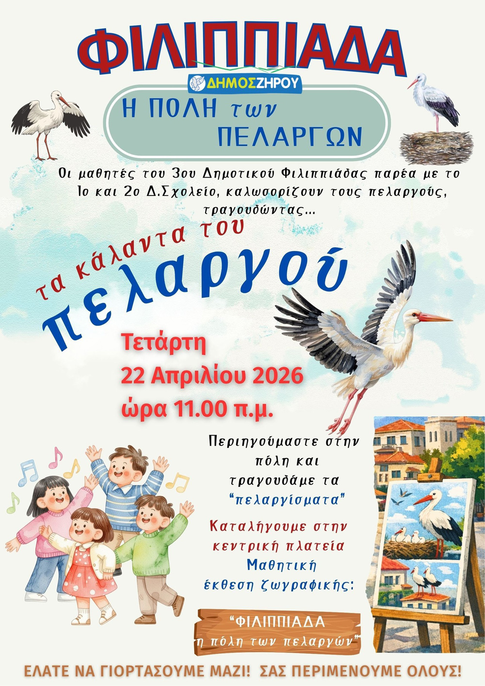 Σε ανακοίνωση που εξέδωσε ο Δήμος Ζηρού αναφέρονται τα εξής: Ο Δήμος μας, μαζί με τους μαθητές του 3ου Δημοτικού Σχολείου Φιλιππιάδας και σε συνεργασία με το 1ο και 2ο Δημοτικό, σας προσκαλούν σε μια ξεχωριστή, χαρούμενη δράση αφιερωμένη στην άφιξη των πελαργών στην πόλη μας!