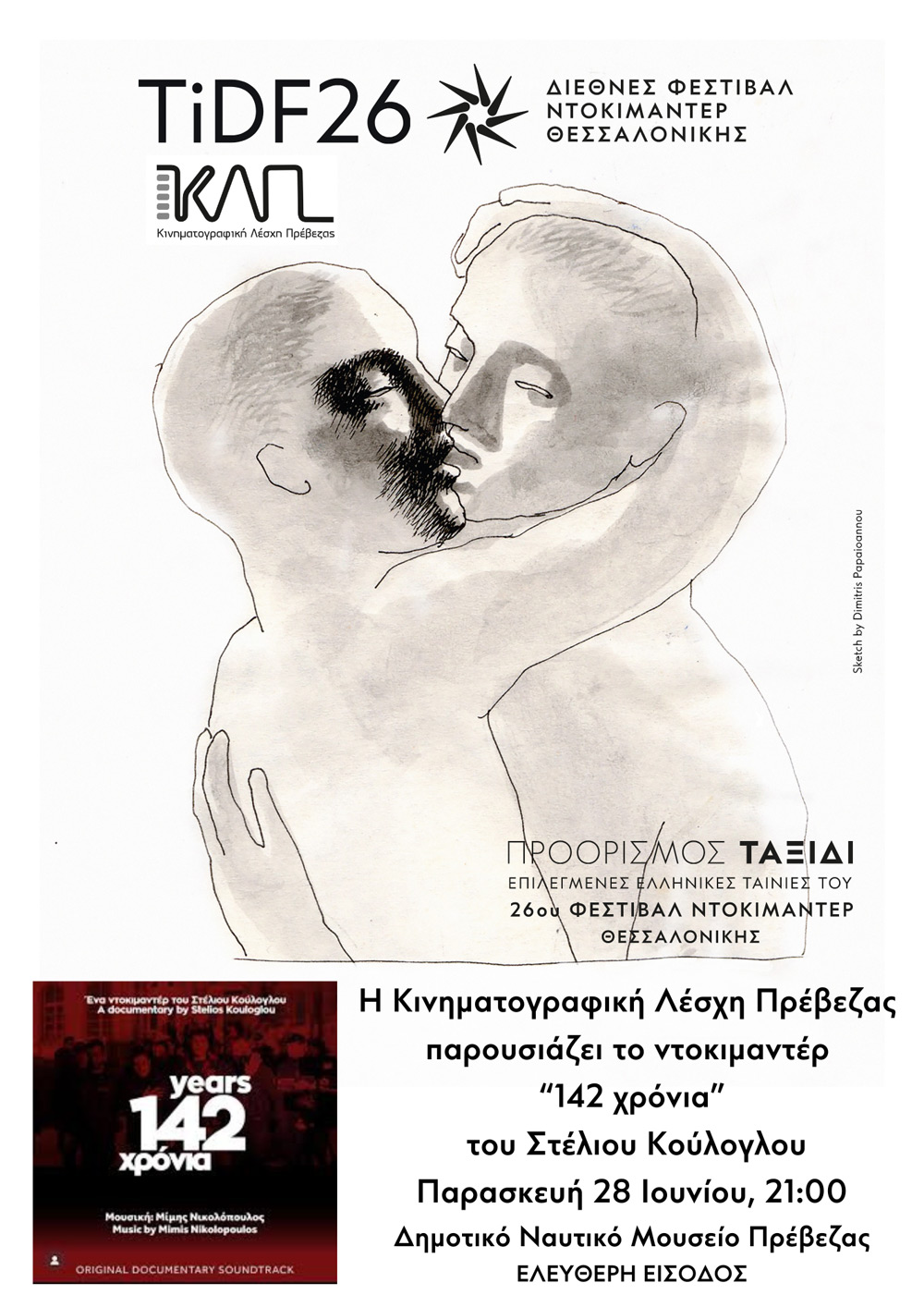 Η Κινηματογραφική Λέσχη Πρέβεζας επιμένει θερινά και παρουσιάζει στον αύλειο χώρο του Ναυτικού Μουσείου, δίπλα στο νερό την Παρασκευή 28 Ιουνίου και ώρα 21.00 το ντοκιμαντέρ του Στέλιου Κούλογλου " 142 χρόνια". Το δικαστικό θρίλερ έκανε παγκόσμια πρεμιέρα στο πλαίσιο του 26ου Διεθνούς Φεστιβάλ Ντοκιμαντέρ Θεσσαλονίκης. Η είσοδος είναι ελεύθερη. Η προβολή των ταινιών του 26ου Διεθνούς Φεστιβάλ Ντοκιμαντέρ Θεσσαλονίκης υποστηρίζεται από τον Αποσπερίτη, καφέ-ποτό –μουσική, Αγ. Γεωργίου 27, Πρέβεζα.