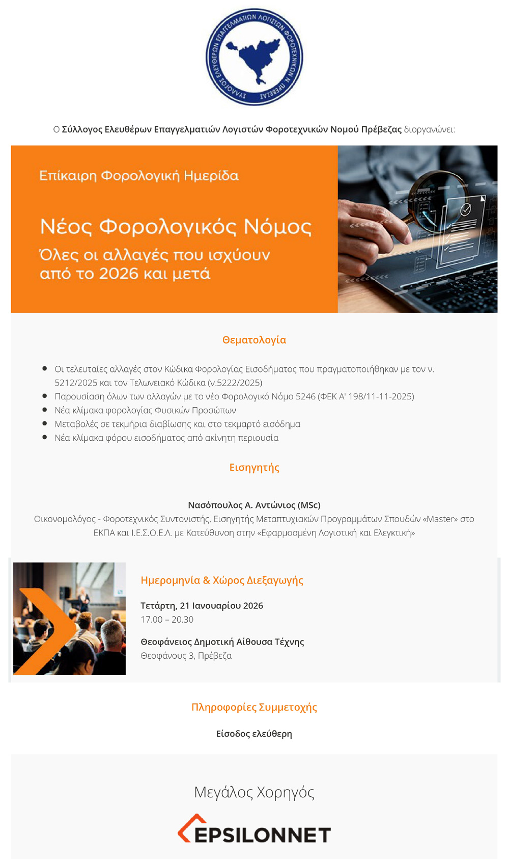Ο Σύλλογος Ελεύθερων Επαγγελματιών Λογιστών Φοροτεχνικών Ν. Πρέβεζας διοργανώνει ημερίδα με θέμα: «Νέος Φορολογικός Νόμος», σε συνεργασία με την εταιρεία EPSILONNET και με εισηγητή τον κ. Νασόπουλο Α. Αντώνιο (MSc) Οικονομολόγο - Φοροτεχνικό Συντονιστή, Εισηγητή Μεταπτυχιακών Προγραμμάτων Σπουδών «Master» στο ΕΚΠΑ και I.Ε.Σ.Ο.Ε.Λ. με Κατεύθυνση στην «Εφαρμοσμένη Λογιστική και Ελεγκτική» την Τετάρτη 21/01/2026 και ώρα 17:00 στην Θεοφάνειο Αίθουσα.
