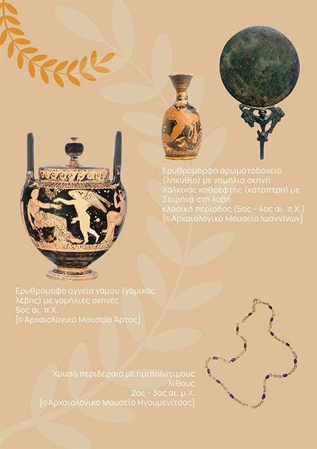 Στο πλαίσιο αυτό, το ΑΜΝ δανείστηκε και εκθέτει -με τον τίτλο ΝΥΜΦΟΚΟΜΕΙΝ- ένα πήλινο αγγείο (γαμικός λέβης) με γαμήλιες σκηνές από το Αρχαιολογικό Μουσείο Άρτας, ένα χρυσό περιδέραιο από το Αρχαιολογικό Μουσείο Ηγουμενίτσας και ένα πήλινο αρωματοδοχείο (ληκύθιο) και έναν χάλκινο καθρέφτη (κάτοπτρο) από το Αρχαιολογικό Μουσείο Ιωαννίνων. Τα αντικείμενα σχετίζονται με τον κόσμο της γυναίκας, την περιποίηση και τον στολισμό της, ιδιαίτερα κατά την προετοιμασία για την τέλεση του γάμου της (νυμφοκομείν) και εκτίθενται σε ξεχωριστή προθήκη στην ενότητα της μόνιμης έκθεσης του ΑΜΝ, «Καλλωπισμός - Κοσμήματα».