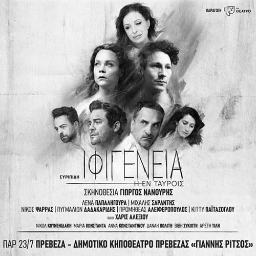 Η παράσταση «Ιφιγένεια η εν Ταύροις» του Ευριπίδη, σε σκηνοθεσία Γιώργου Νανούρη και μετάφραση Γιώργου Ιωάννου θα παρουσιαστεί στην Πρέβεζα την Παρασκευή 23 Ιουλίου και ώρα 21:30, στο Δημοτικό Κηποθέατρο «Γιάννης Ρίτσος».