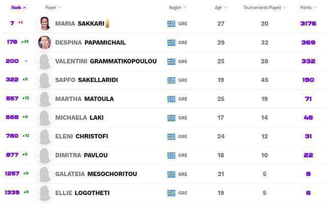 Πάντα πρώτη στη χώρα μας είναι η Μαρία Σάκκαρη, η μόνη Ελληνίδα που έχει ανεβεί στο Top 10 και που βρίσκεται στο Top 10 σταθερά τον τελευταίο χρόνο, παρόλο που σήμερα έχασε μια θέση και υποχώρησε στο Νο.7.