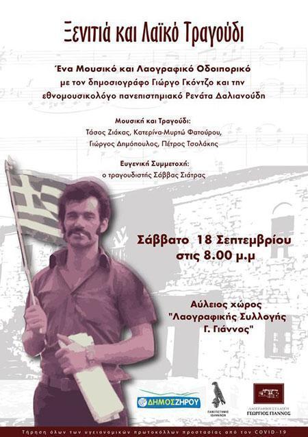 Εκδήλωση που φέρει τον τίτλο «Ξενιτιά και Λαϊκό Τραγούδι» θα πραγματοποιηθεί στο χώρο της Λαογραφικής Συλλογής «Γεώργιος Γιάννος», στο Θεσπρωτικό το Σάββατο 18 Σεπτεμβρίου και ώρα 8 μμ. Το πρόγραμμα περιλαμβάνει μαρτυρίες Λελοβιτών μεταναστών, πλαισιωμένες με σπάνιες εκτελέσεις λαϊκών τραγουδιών από τις δεκαετίες ’50, '60 και '70, αλλά και ζωντανή μουσική.