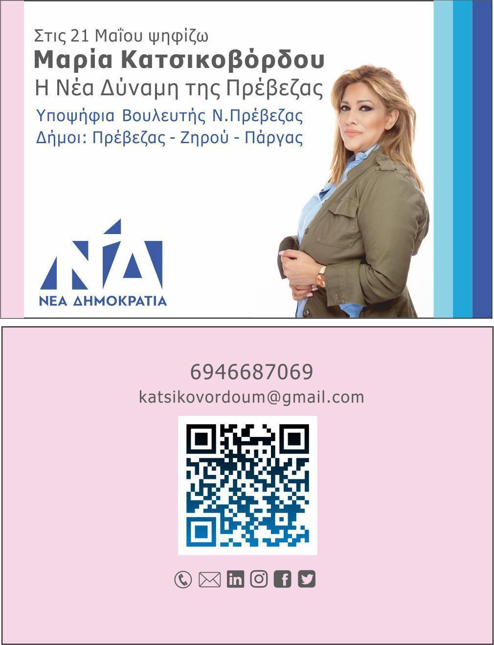 Επίσης, η Μαρία, περα από το σύντομο βιογραφικό και τα στοιχεία επικοινωνίας που αναφέρει στο έντυπο υλικό, επιθυμεί να προσελκύσει το ενδιαφέρον των ψηφοφόρων με μια πρωτότυπη σκέψη. Με την χρήση smartphone, μέσα από ένα κωδικό QR, ο ψηφοφόρος μεταφέρεται σε ένα ηχητικό μήνυμα στο διαδίκτυο, όπου η υποψήφια Βουλευτής καλεί σε στήριξη στον αγώνα της και προτρέπει σε άμεση επικοινωνία μαζί της τους πολίτες του Νομού. Ακολουθεί το ηχητικό μήνυμα: “Γειά σας. Είμαι η Μαρία Κατσικοβόρδου, υποψήφια Βουλευτής στο Νομό Πρέβεζας με τη Νέα Δημοκρατία. Με το μήνυμα αυτό ζητώ την στήριξή σας στις εκλογές στις 21 Μάη. Ζητώ την ψήφο σας, ζητώ την δύναμή σας να αλλάξουμε μαζί τα πάντα στο νομό. Έχετε όλα τα στοιχεία επικοινωνίας μαζί μου στην κάρτα αυτή, μην διστάσετε να μου στείλετε μήνυμα, να με πάρετε τηλέφωνο, να με ρωτήσετε ό,τι θέλετε. Να με γνωρίσετε. Είμαι εδώ, για εσάς.”