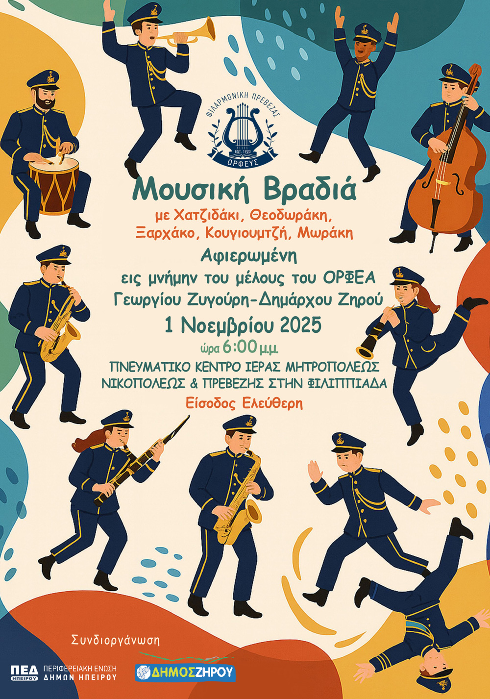 Η Φιλαρμονική Πρέβεζας «Ο Ορφεύς», σας προσκαλεί σε μουσική βραδιά με Χατζηδάκι, Θεοδωράκη, Ξαρχάκο, Κουγιουμτζή, Μωράκη, αφιερωμένη στον τέως Δήμαρχο Ζηρού και πρώην μέλος αυτής, Γεώργιο Ζυγούρη, που θα πραγματοποιηθεί το Σάββατο 1 Νοεμβρίου 2025 και ώρα 18:00, στο Πνευματικό Κέντρο Ιεράς Μητροπόλεως Νικοπόλεως και Πρεβέζης στη Φιλιππιάδα. Η εκδήλωση τελεί υπό την αιγίδα του Δήμου Ζηρού και της Περιφερειακής Ένωσης Δήμων Ηπείρου (ΠΕΔ).